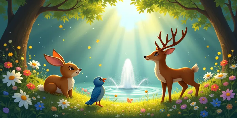 Fern told Hazel a special secret about the forest. Deep in the heart of the woodland, hidden behind a curtain of ivy and moss, there was a secret garden called Sunbeam Glade. In Sunbeam Glade grew brilliant flowers that shone like tiny stars and a little fountain that sang the sweetest melody. But the secret of the glade was not just that it was beautiful it was magical! The flowers and fountain could make dreams come true, yet they needed someone to take care of them every day. Fern explained that these wonders relied on a special kind of magic called Responsibility, and only someone who truly cared about the forest could keep the magic alive.